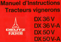 Ce manuel d'instructions de 48 pages présente les tracteurs vignerons Deutz DX36 V et V-A et DX50 V et V-A avec les directives de conduite et les prescriptions de maintenance générale. En français. Il concerne les tracteurs 2 et 4 roues motrices de 34 et 36 chevaux.