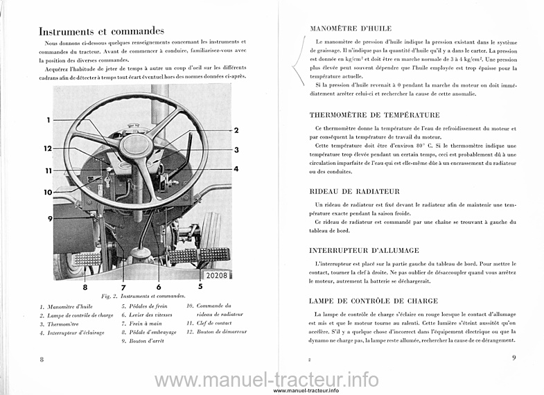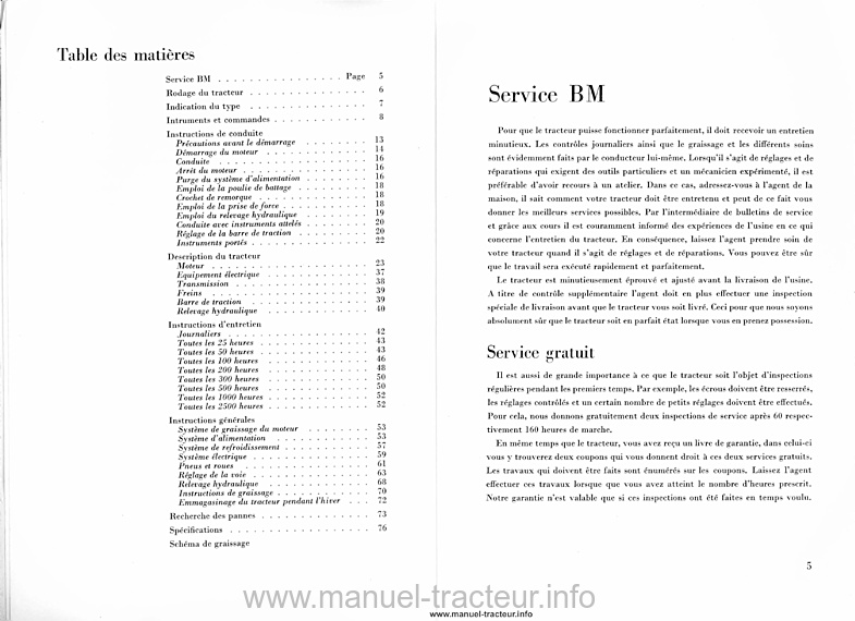 Sommaire : Rodage - Indication du type - Instruments et commandes (démarrage, purge du système d'alimentation, poulie de battage, réglage de la barre de traction) - Instructions de conduite - Description du tracteur - Instructions d'entretien - Instructions générales (graissage moteur, alimentation, refroidissement, électrique, réglage de la voie, instructions de graisssage, emmagasinage du tracteur pendant l'hiver) - Recherche des pannes - Spécifications - Schéma de graissage