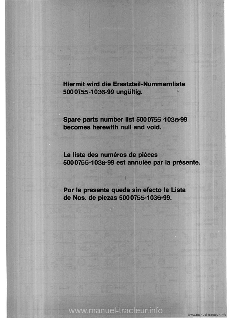 Description : Ce catalogue de pièces de rechange, de plus de 400 pages, présente toutes les parties du tracteur DX 85 avec des vues éclatées et les références de chaque pièces du tracteur. En français, allemand, anglais et espagnol. Publié en juillet 1983.
