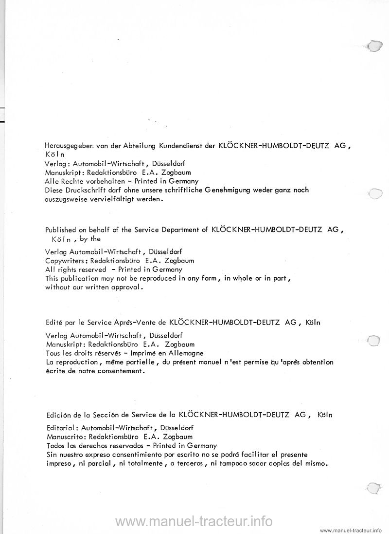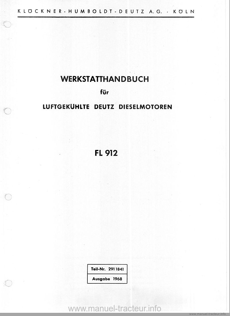 Description : Manuel d'atelier, de plus de 300 pages, de chez Deutz paru en 1968 pour les moteurs F2L912, F3L912, F4L912 et F6L912. Il est en français, allemand, espagnol et anglais. Ce document décrit tous les travaux de montage et de démontage à effectuer au cours d'une réparation, d'un calage ou d'un remplacement de pièces.