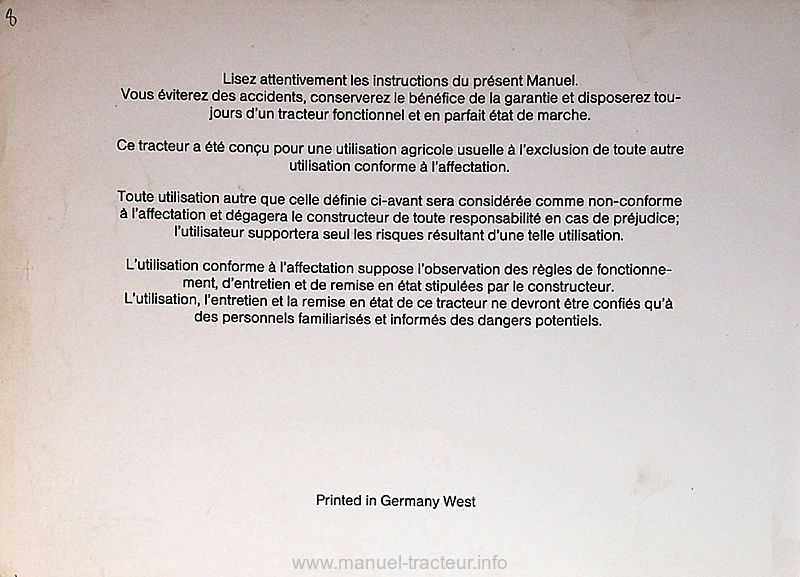 Sommaire : Sécurité, Désignations commerciales du tracteur et variantes, Vérifications périodiques, Avant la mise en marche du tracteur, Mise en route, Attelage des outils, Entraînement des outils aratoires, Commande et adaptat1ion des outils aratoires, Réglage de voie, Masses d'alourdissement, Entretien préventif et maintenance, Travaux de réglage , Conservation-protection du tracteur, Équipement électrique, En cas de pannes de moteur, permanence des dernières améliorations, Caractéristiques techniques, Index alphabétique