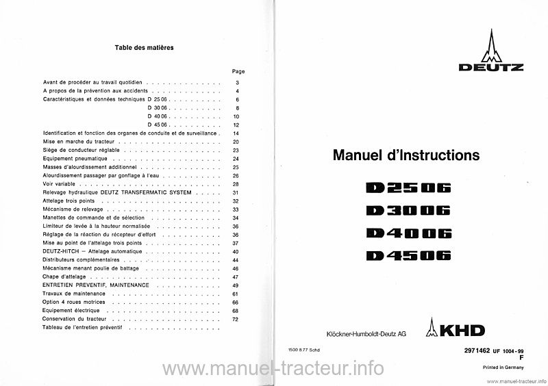 Sommaire : Avant de procéder au travail quotidien - Prévention aux accidents - Caractéristiques et données techniques D 45 06 - Identification et fonction des organes de conduite et de surveillance - Mise en marche du tracteur - Siège de conducteur réglable - Équipement pneumatique - Masses d'alourdissement additionnel - Alourdissement passager par gonflage à l'eau - Voie variable - Relevage hydraulique - Attelage trois points - Mécanisme de relevage - Manettes de commande et de sélection - Limiteur de levée à la hauteur normalisée - Réglage de la réaction du récepteur d'effort - Mise au point de l'attelage trois points - Deutz-Hitch attelage automatique - Distributeurs complémentaires - Mécanisme menant poulie de battage - Chape d'attelage - Entretien préventif, maintenance - Option 4 roues motrices - Équipement électrique - Conservation du tracteur - Tableau de l'entretien préventif.