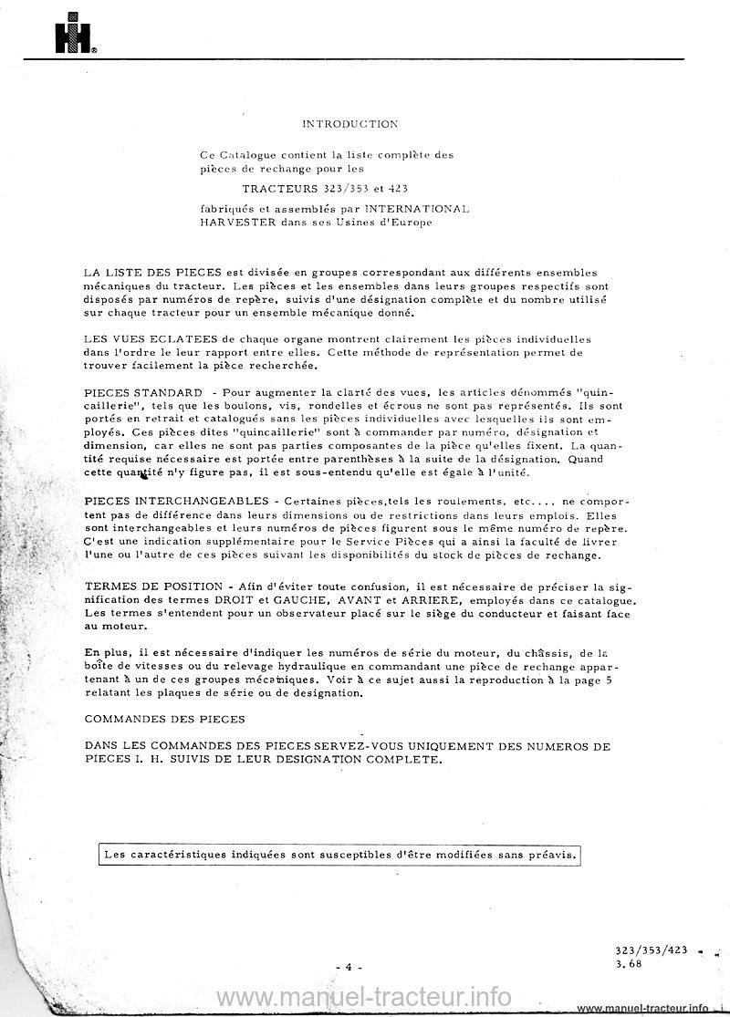Catalogue pièces détachées McCORMICK IH 323 353 423
