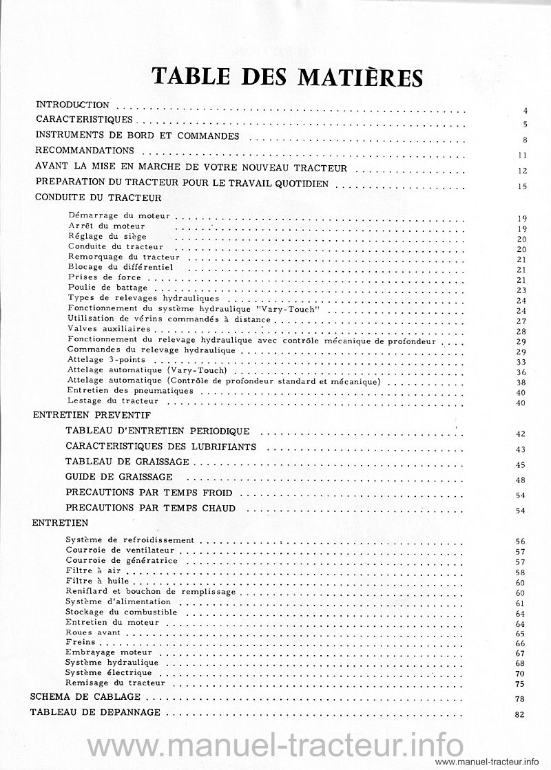 Sommaire : Introduction - Caractéristiques - Instruments de bord et commandes - Recommandations - Avant la mise en marche de votre tracteur - Préparation du tracteur pour le travail quotidien - Conduite du tracteur - Entretien préventif ( entretien périodique, lubrifiants, tableau de graissage, précaution temps froid et chaud) - Entretien (refroidissement, courroie, filtres, reniflard, alimentation, combustible, moteur, roues, freins, embrayage, système hydraulique et électrique, remisage) - Schéma de câblage - Tableau de dépannage.