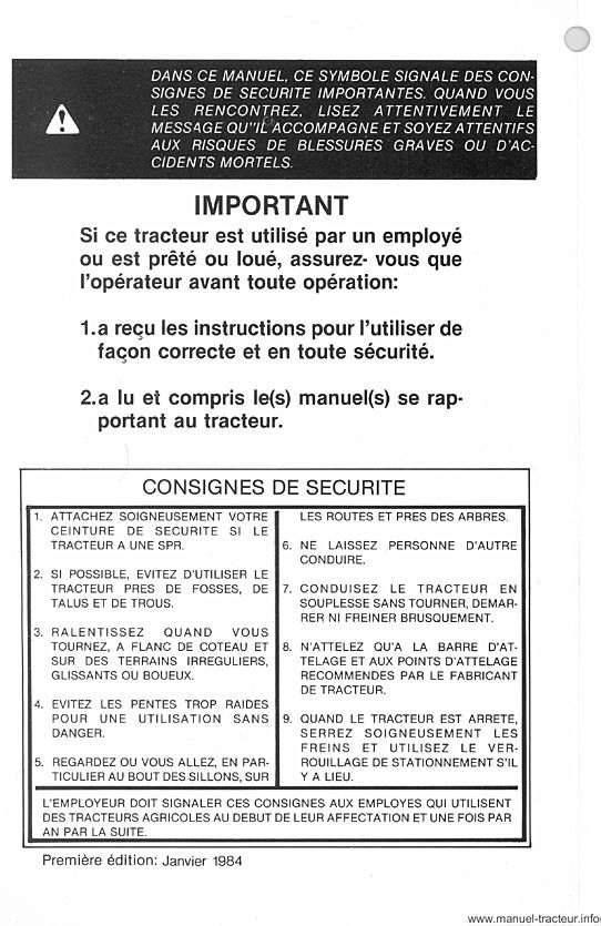 Sommaire : Sécurité - Signaux à bras - Numéros de séries - Caractéristiques moteur et générales - Vitesses - Lubrification - Instructions d'utilisation - Entretien préventif
