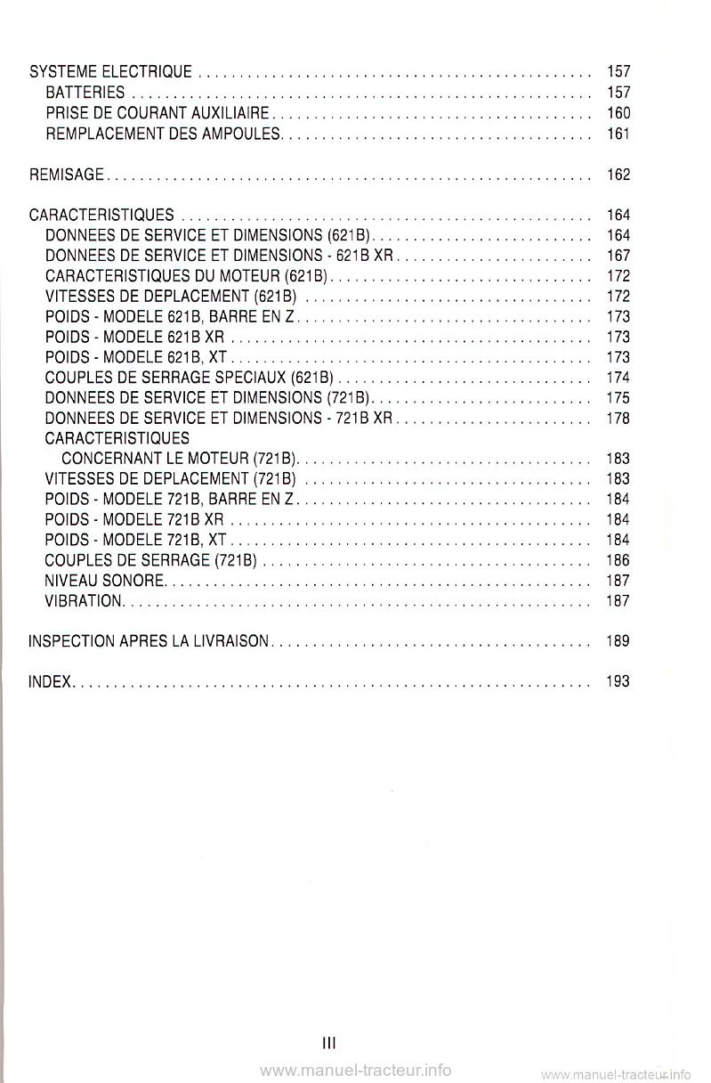 Sommaire : Au propriétaire - Identification - Sécurité - Instruments/Commandes - fonctionnement - Utilisation sur le chantier - Roues / Pneus / Lest - Graissage / Filtres / Liquides - Entretien / Réglages - Système électrique - Remisage - Caractéristiques - Inspection après livraison - Index