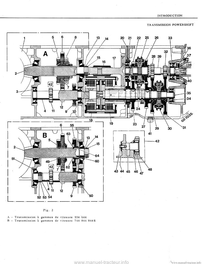 Sommaire : Introduction - Système Powershift - Pompe hydraulique Powershift - Tuyauterie Hydraulique - Mécanisme de sélection des vitesses - Dépose et remise en place de la transmission - Arbre primaire et synchroniseurs - Arbre intermédiaire avant - Arbre secondaire et sélection de gammes de vitesses - Sélection de gammes de vitesses en prise constante - Arbre intermédiaire arrière et pignon fou de gamme arrière - Réducteur de vitesse - Différentiel - Prises de force - Outils spéciaux