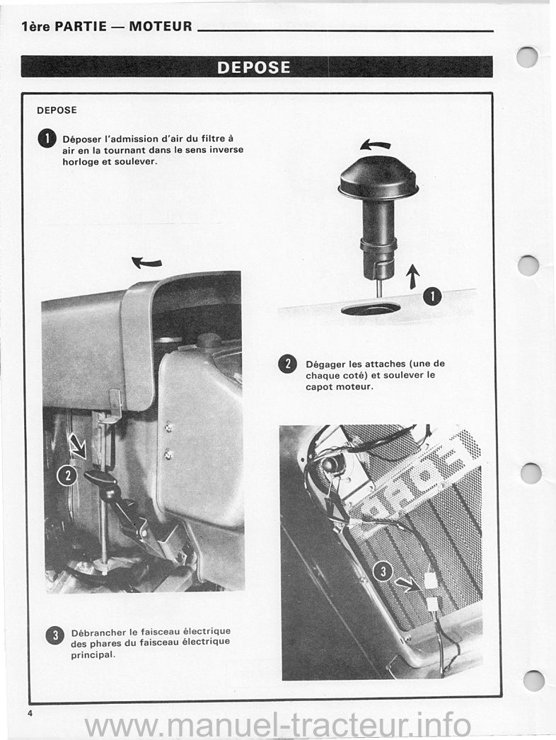 Sommaire : Moteur (circuit de lubrification et circuit de refroidissement) - Alimentation diesel - Equipement électrique - Transmission et embrayage - Différentiel, pont arrière et pièces annexes - Équipement hydraulique - Direction et essieu avant - Jantes et pneus - Supplément (distributeur de vérin auxiliaire, assistance de direction)