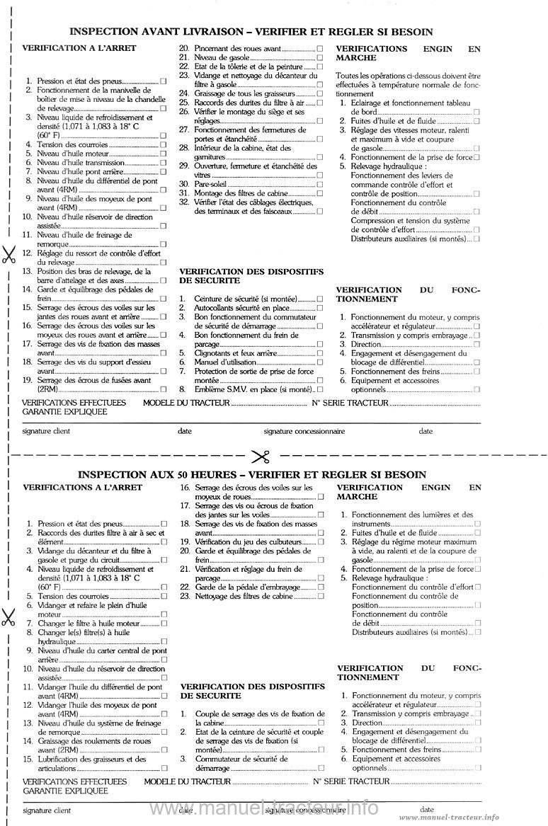 Sommaire : Conseils de sécurité - Symboles internationaux - Fiche de contrôle à 50 heuresCommandes, instruments et fonctionnement : réglage du siège, tableau de bord, démarrage et arrêt du tracteur, frein à main et pédales de commande, transmission, pont avant moteur, prise de force, attelage 3 points, relevage hydraulique, réglage des voies, lestage du tracteur, gonflage des pneus.Lubrification et entretien : tableau d'entretien, opération d'entretien , entretien général. Spécifications.