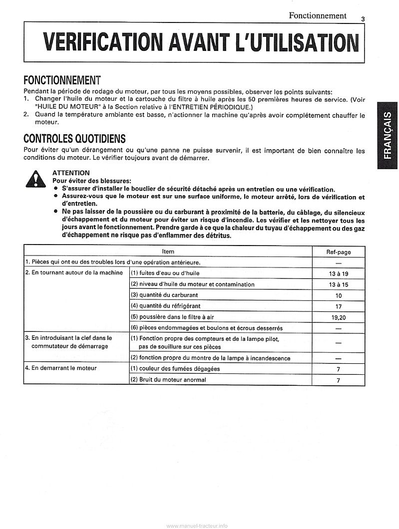 Sommaire : Entretien du moteur - Fonctionnement du moteur - Cycle du moteur inverse et remèdes - Intervalles d'entretien - Carburant - Huile du moteur - Radiateur - Filtre à air - batterie - Câblage électrique - Courroie de ventilateur - Transport et remisage - Dépannage - Spécifications - Diagrammes de montage des fils électriques