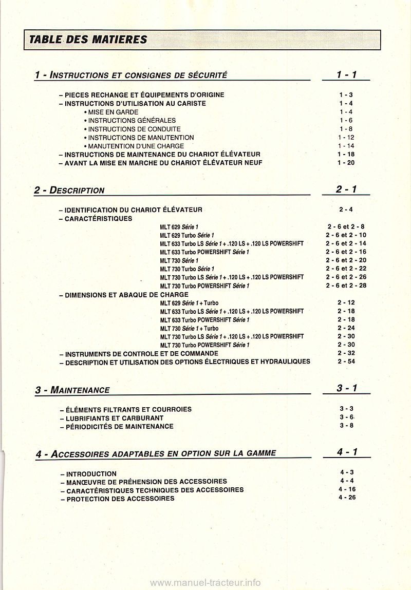 Description : Cette notice d'instructions contient 150 pages sur l'utilisation et l'entretien courant des chariots élévateurs suivants : MLT 629/730 Série1 et Turbo Série 1, MLT 633/730 Turbo LS Série 1, Turbo Powershift Série 1, 120LS Série 1 et 120LS Powershift Série 1. Publié le 20 octobre 2000, en français.