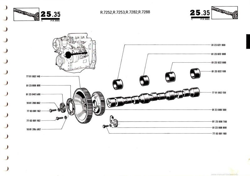 Description : Catalogue de pièces détachées PR886 avec les éclatées et les références de pièces, moteur compris, (sans nomenclature) pour les tracteurs suivants : Renault R50 de type R7213 équipé du moteur diesel 2 cylindres MWM D 325-2R60. Et des tracteurs R70 R80 R82 de type respectif R7253, R7252, R7282 et R7288 équipés du moteur diesel 3 cylindres MWM D 325-3. Plus de 170 pages en français, allemand, anglais et néerlandais.