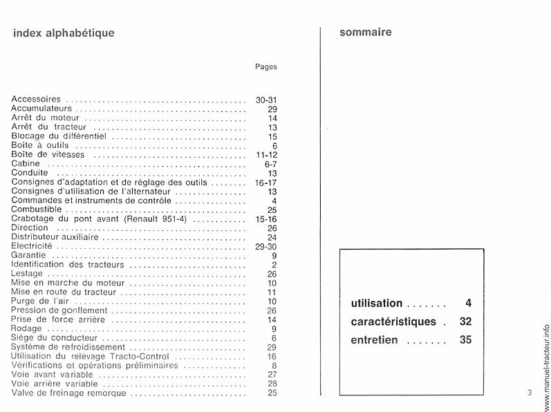Sommaire : Utilisation (arrêt du moteur, boîte de vitesses, conduite, commandes) - Caractéristiques Entretien( purge de l'air, pression de gonflement, système de refroidissement, lestage, et...)