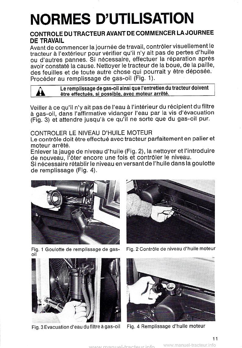 Sommaire : Normes importantes - Prévention des accidents - Commande des pièces de rechange - Service agréé d'après-vente - Garanties - Ravitaillements - Normes d'utilisation - Contrôle du tracteur avant de commencer le travail - Poste de conduite - Moteur - Embrayage - Boîte de vitesses - Blocage des différentiels - Freins - Traction avant - Prise de force arrière - Prise de force avant - Relevage hydraulique arrière - Relevage hydraulique avant - Système hydraulique - Distributeur hydraulique auxiliaire - Crochet d'attelage - Attelage 3 points - Lest avant - Cabine - Instructions pour l'entretien - Moteur - Filtre à air - Refroidissement - Graissage - Alimentation - Vidange d'eau du filtre à gasoil - Purge d'air du circuit d'alimentation - Injection - Équipement électrique du moteur - Embrayage - Boîte de vitesses - Différentiel - Réducteurs arrière - Direction hydrostatique - Essieu avant - Traction avant - Blocage de différentiel avant - Freins avant et arrière - Freinage hydraulique pour remorque - Cabine - Relevage hydraulique - Roues - Lestage du tracteur par l'introduction d'eau dans les roues - Points de graissage - Opérations périodiques d'entretien - DONNEES TECHNIQUES : Vitesses d'avancement - Dimensions et pressions de gonflage des pneus - Réglage des voies - Dimensions et poids - Schéma de branchement électrique - Application d'outil sur le tracteur