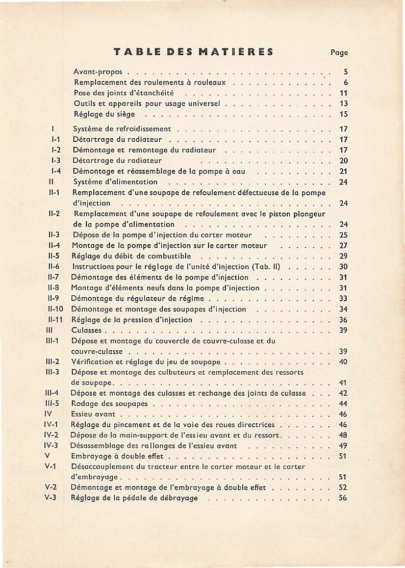 Sommaire : Système de refroidissement - Radiateur - Soupape de refoulement - Pompe d'injection - Régulateur de régime - Culasses - Essieu avant - Roues directrices - Essieu avant - Embrayage - Pédale de débrayage - CArter moteur - Moteur - Vitesses - Pompe à huile - Relevage hydraulique - Dynamo - Équipement électrique - Batterie - Etc ...